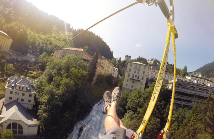 Flying Waters - das ist eine Fahrt an Rollen auf einem Drahtseil – hängend über die Schlucht der Gasteiner Ache. Was sich so gefährlich anhört, wird aber durch die perfekte Sicherung von Profis zum risikofreien Abenteuerspaß für die ganze Familie.