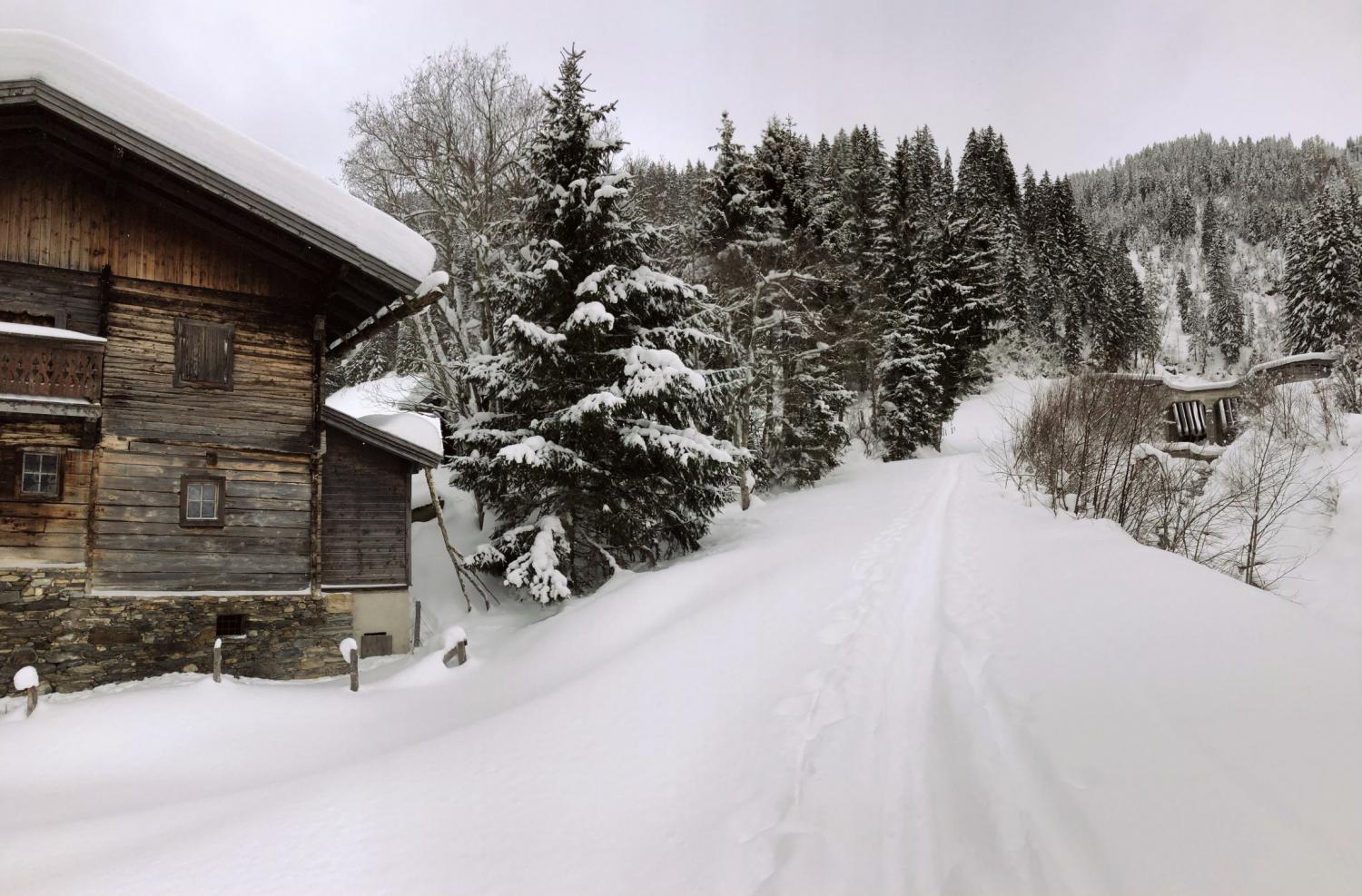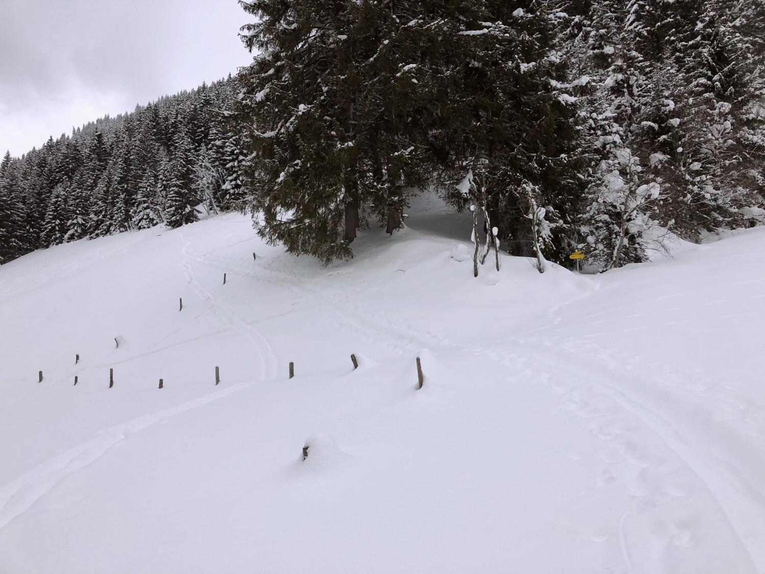 Der Weg beginnt hinter der Ski-Anfängerwiese im Angertal. Dort folgen wir der Spur nach oben und tauchen bald in den winterlichen Wald ein. Rhythmisch steigen wir aufwärts und genießen die Stille und besondere Athmosphäre zwischen den verschneiten Bäumen.