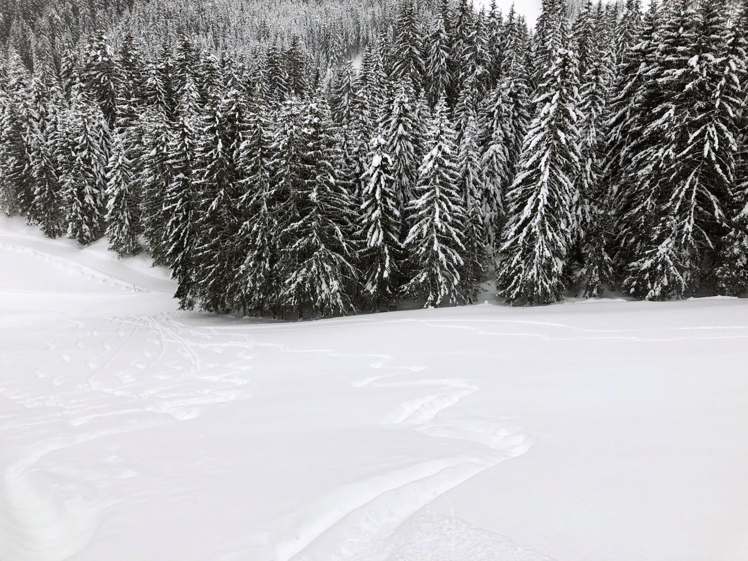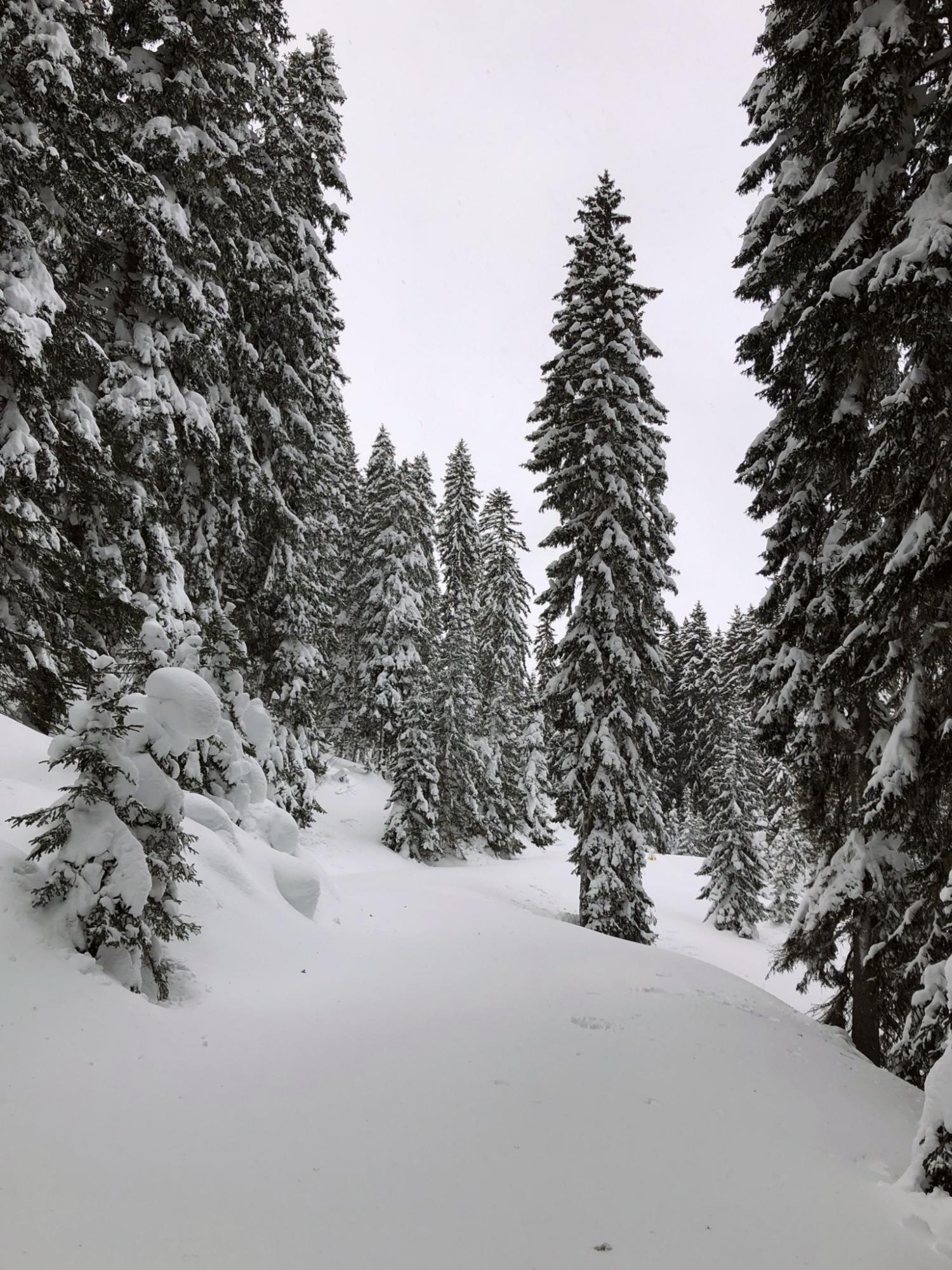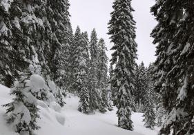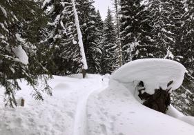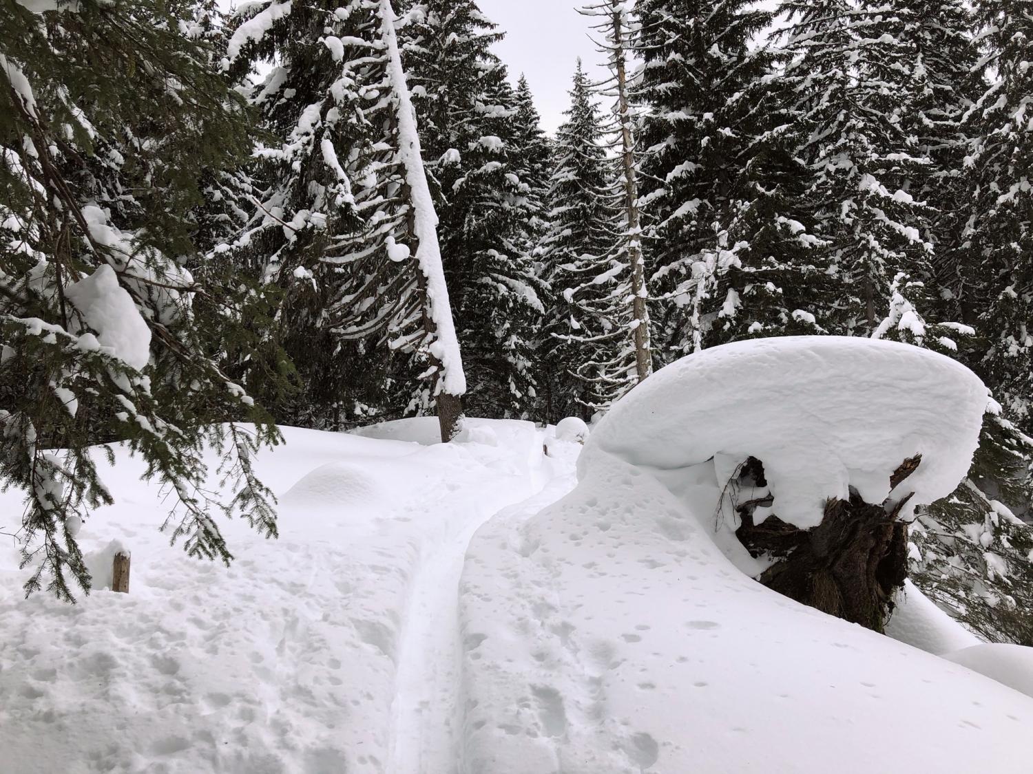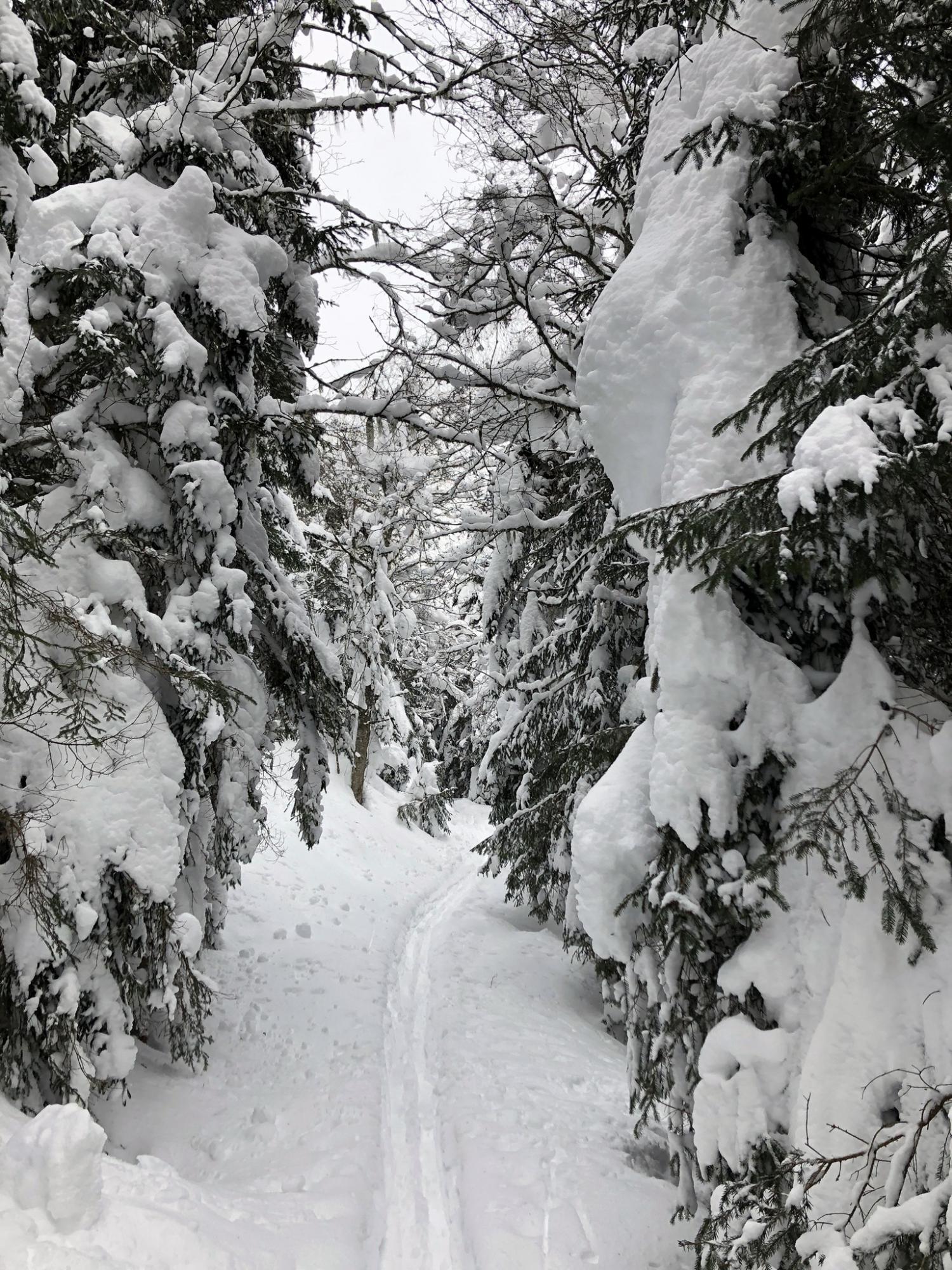 Eine einfache Skitour durch tief verschneite Wälder.
