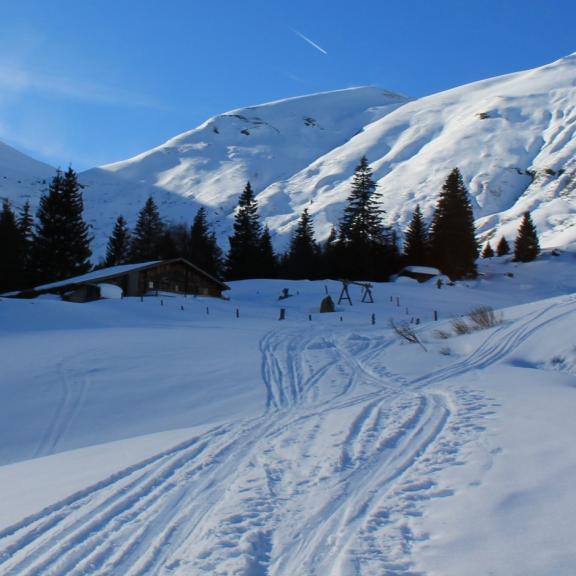 Eine ausgewiesene Skiroute beginnend an der Bergstation der Kaserebenbahn im Gebiet der Schlossalm.